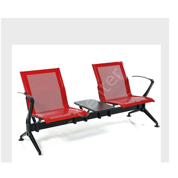 522 ikili Sehpalı Saclı bekleme koltuğumuz tamamen delikli sac malzeme den üretilmiş olup,farklı renklerde alternatifleri vardır. Elektrostatik toz boya ile boyanmaktadır, isteğe bağlı olarak farklı renklerde kullanılabilmektedir .İskelet yapısı ve Kolları alüminyumdur.