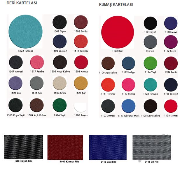 Opsiyonel Seçenekler: plastik – metal ayak, başlıklı – başlıksız, tekerlekli ayak – sabit ayak – U ayak